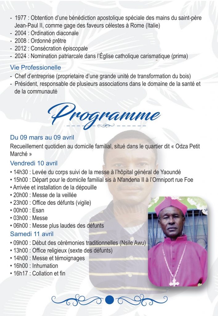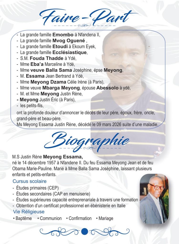 C’est avec une profonde émotion et dans l’espérance de la Résurrection que l’Évêché s’associe aux familles Emombo, Mvog Oguené, Etoudi et à la grande famille ecclésiastique pour annoncer le rappel à Dieu de notre père et guide spirituel, décédé le 9 mars 2026. Patriarche au sein de l’Église catholique charismatique, chef d’entreprise émérite et figure dévouée de notre communauté, Monseigneur Justin Rène Meyong Essama laisse le souvenir d’un homme de foi, de vision et de cœur. Veuillez retrouver ci-dessous le programme officiel de la célébration d’une vie professionnelle, communautaire et ecclésiastique bien menée.